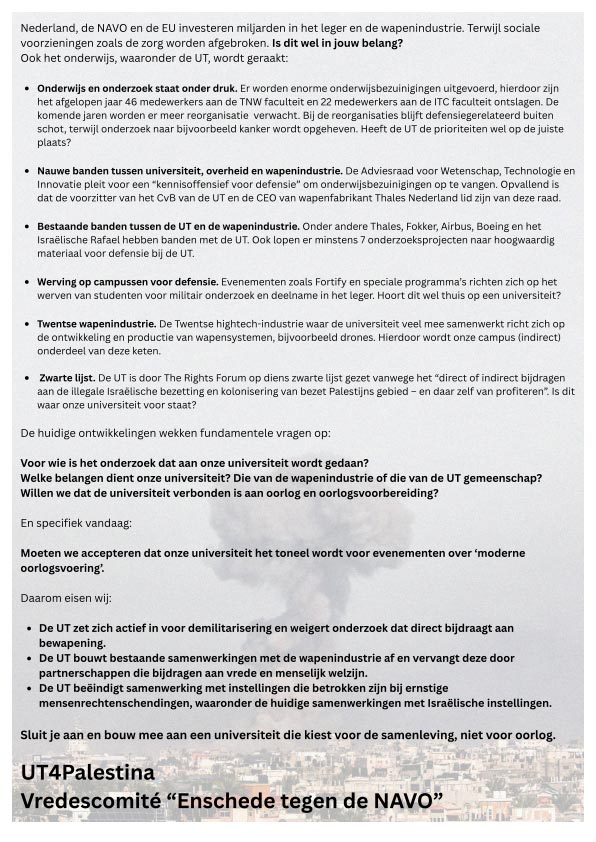 Enkele leden van UT4Palestina en het Vredescomité “Enschede tegen de NAVO” (vier studenten, twee oud-studenten en twee oud-medewerkers) hebben vanochtend flyers uitgedeeld aan bezoekers van het symposium (onder wie ook Martin Wijnen met wie nog even een kort gesprekje kon worden gevoerd) en aan studenten en medewerkers die om andere – meer reguliere – redenen in het gebouw moesten zijn. Enkelen van hen complimenteerden ons met deze actie en wensten ons succes.