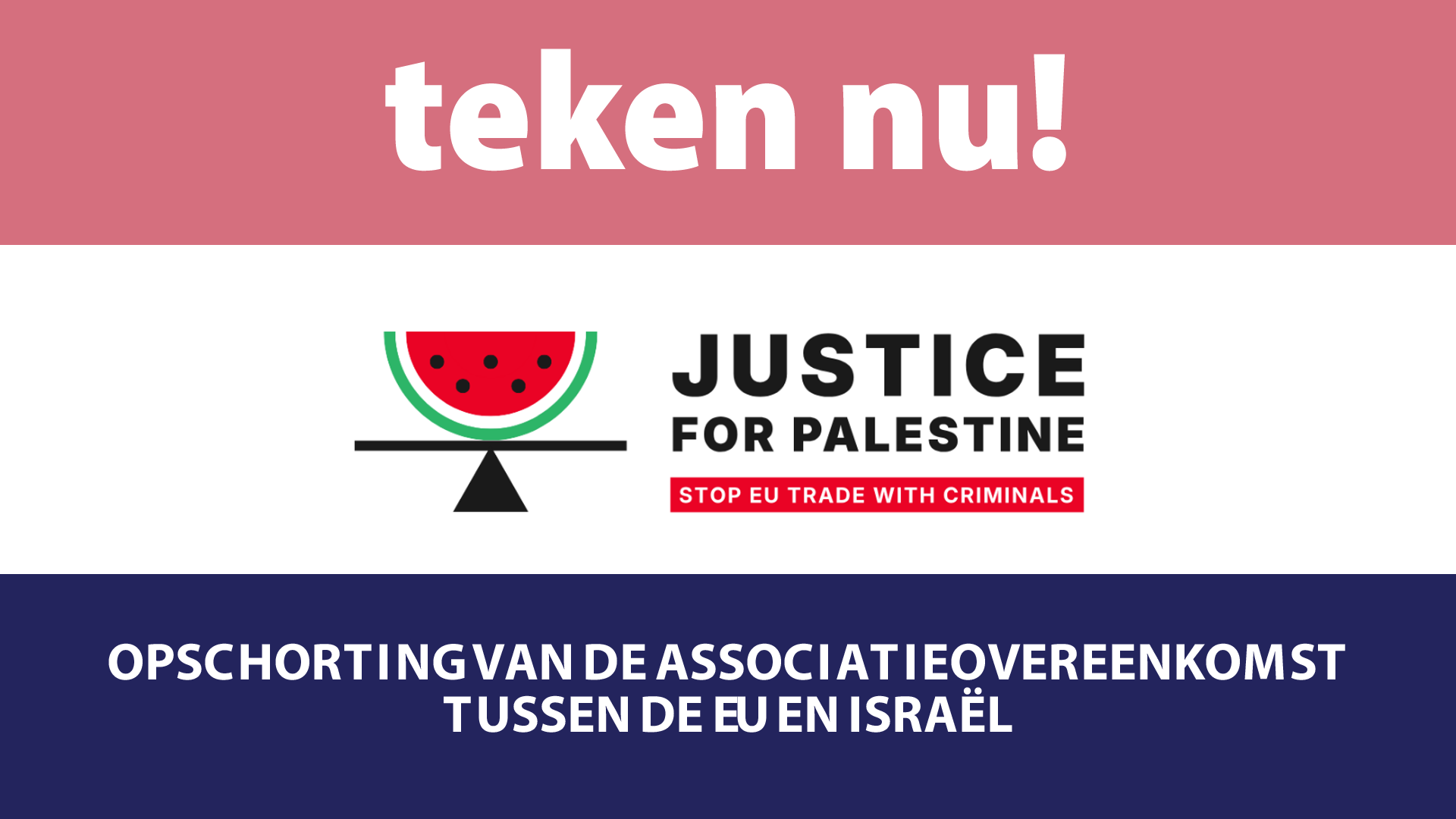 De associatieovereenkomst tussen de EU en Israël regelt de politieke en economische samenwerking tussen de twee. In de zomer van afgelopen jaar hebben Europese ministers vanwege de ophef na de eerste twee rode lijnen overlegd over opschorting van dit verdrag, maar uiteindelijk in juli besloten de overeenkomst niet op te schorten. Tot op de dag van vandaag blijft het dus van kracht, en daarmee blijft de EU dus innig verbonden met Israël, ondanks aanhoudende en recent weer opschroeven van misdaden tegen onze medemensen. Om hier verandering in te brengen is de European Left Alliance partij van het Europees Parlement het Europese Burgerinitiatief Justice for Palestine gestart. Zij schrijven het volgende: